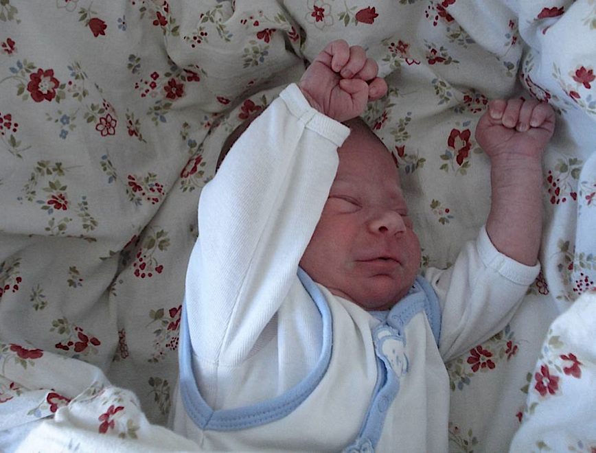 Nun war auch Meike dazu gekommen, zwischen den Wehen war ich wieder sehr klar und wir unterhielten uns sogar ein wenig. Jule gab mir super Anweisungen. Ich bin so froh, dass sie das so toll gemacht hat. Alles, was sie sagte und gemacht hat, war einfach nur richtig und gut für mich. Jule warnte mich vor, dass es bald einen Schmerz geben würde, von dem manche Frauen berichten, sie hätten das Gefühl, es würde sie von innen zerreißen und genau an diesem Punkt müsste ich weiter drücken und nicht aufgeben. Alle spornten mich so gut an, ich wollte es schnell schaffen und dieser eben beschriebene Schmerz blieb bei mir aus. Jule schützte meinen Damm mit einem in heißem Kaffee getränkten Waschlappen. Dies gab mir echte Erleichterung. Es gab einen kurzen brennenden Schmerz und schon guckte der Kopf ein Stück raus, das spürte ich. Noch zwei Wehen und der Kopf war draußen. Es war witzigerweise ein Gefühl, als würde man ein Ei legen und plopp ein Gefühl, als wäre eine Blase geplatzt, war der Kopf komplett geboren. Der Rest war ein Kinderspiel und es ist wirklich vergleichbar mit der Geburt eines Kalbes oder Fohlen, so kam unser Kolja um 11:10 Uhr in einem Schwung heraus. Beim Zurückdenken an diesen Moment bekomme ich jetzt mehr als drei Wochen später noch eine Gänsehaut. Da lag er nun bläulich und er kam mir so unglaublich riesig vor, ich hatte Probleme damit zu realisieren, dass er in mir drinnen gewesen war. Kurz war ich ein bisschen traurig, schließlich war die Schwangerschaft eine wirklich schöne Zeit, aber dann freute ich mich unglaublich, weil er endlich da war. Mika war total „geflasht“ und konnte gar nichts mehr sagen, auch der kleine Mann meldete sich mit keinem Wort. Er schmatzte nur ein wenig vor sich hin. Es war ein unbeschreiblich ruhiger Moment und ich möchte diesen nie wieder missen müssen.